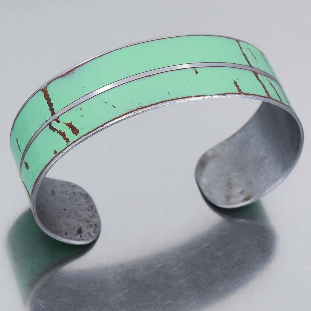 Alfonso is shaped from the metal of a 1975 Dodge pickup that once served as a Forest Service truck, still carrying its original turquoise green paint. The color is instantly recognizable and tied to the hardworking trucks that spent their days deep in the woods and backcountry roads. Hand formed into a smooth cuff, Alfonso transforms this salvaged truck into distinctive art jewelry. The result is a bracelet rich with history, rugged character, and unmistakable Joyride style.