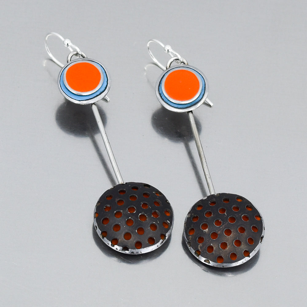 Blanche is made from the metal of a 1977 International Scout in blue and a 1974 Ford F150 in orange, paired with salvaged black perforated steel for strong graphic contrast. The bold mix of color and texture gives these earrings a striking, modern edge with unmistakable presence. Hand shaped into a statement design, Blanche turns recycled vintage car parts into eye catching art jewelry. Big, unique, and full of character, these earrings are made for those who love confident, standout style.