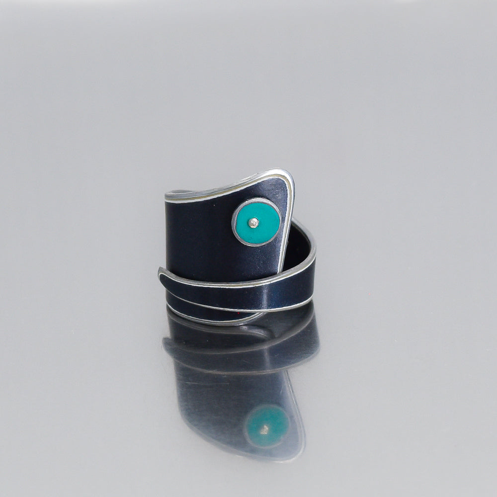 Della is shaped from the metal of a 2021 Mercedes Sprinter and a 1965 Ford Econoline Supervan, blending the original black paint with vibrant turquoise in a bold, modern contrast. The mix of new and vintage automotive metal gives this ring a look that is both refined and full of story. Each piece of jewelry is hand formed to highlight the natural character of the original paint, turning recycled car parts into art jewelry. Della stands out with confident color and unmistakable Joyride style.