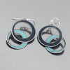 Evelyn is made from the metal of a 2021 Mercedes Sprinter in black and a 1960 Dodge pickup in a light metallic blue, each keeping its original car paint intact. The clean black paired with classic blue creates a fresh contrast. Shaped into lightweight circles with easy movement, these earrings feel fun and effortless. Hand formed from recycled car parts Evelyn blends modern lines with vintage history in a design that is simple, playful, and unmistakably Joyride.