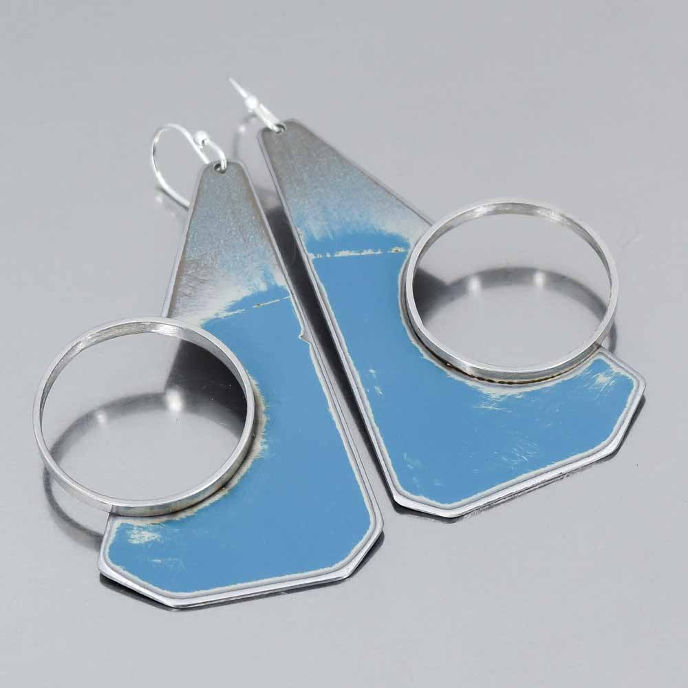 Isabel is made from the metal of an iconic 1970 VW Karmann Ghia with the original blue car paint still intact. Big, bold and eye catching, these earrings turn recycled vintage car parts into striking contemporary art jewelry. The metal is shaped by hand into forms that offer color, movement, and undeniable eye catching presence. Isabel brings authentic Joyride character to anyone who loves statement pieces with real history.