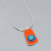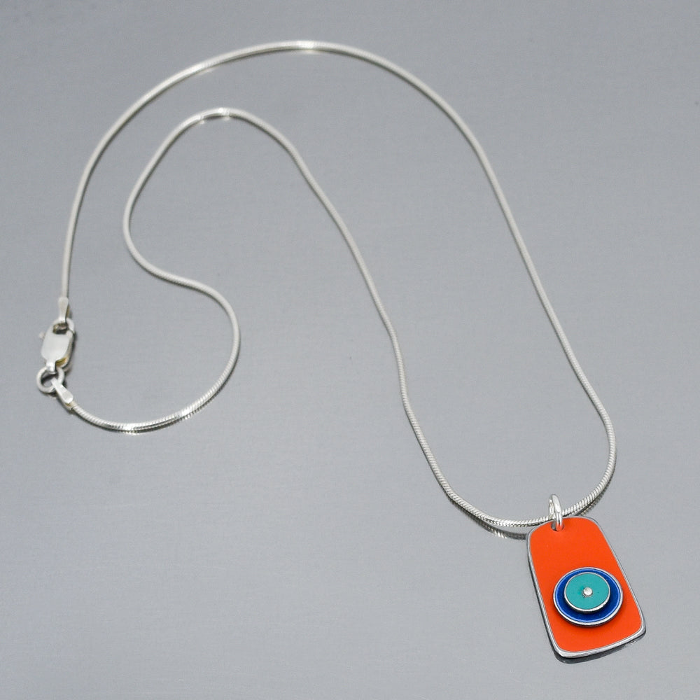 Marion is made from the metal of three classic Fords, bright orange from a 1974 Ford pickup, soft blue from a 1965 Ford pickup, and warm turquoise from a 1965 Ford Econoline van, each retaining its original car paint. The colors create a small pendant with a gentle, easygoing charm and a touch of vintage brightness. We shaped each piece of metal by hand into a compact form that feels smooth and natural to wear. Set on a sterling silver snake chain in your choice of length, Marion carries quiet history and true Joyride character.